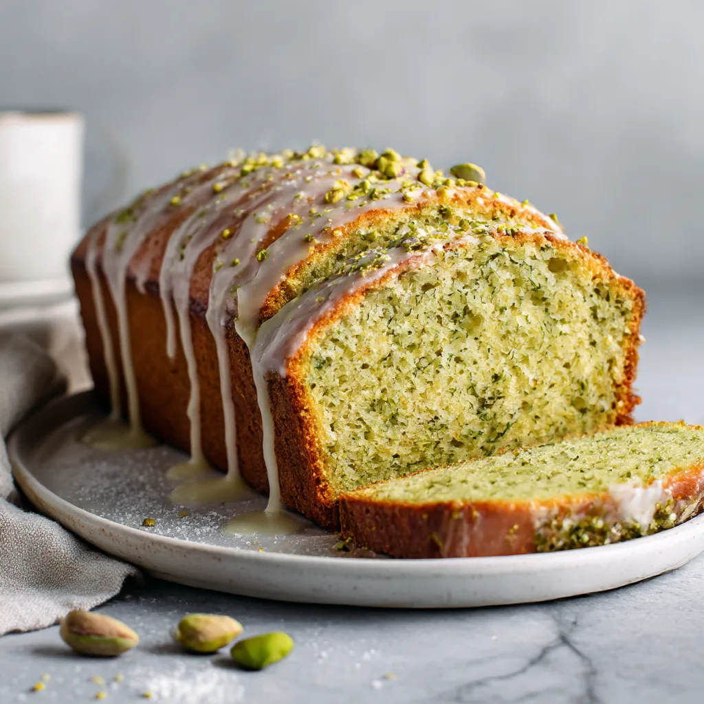 A soft, nutty pistachio loaf cake topped with a smooth vanilla glaze, perfect for dessert or afternoon tea.