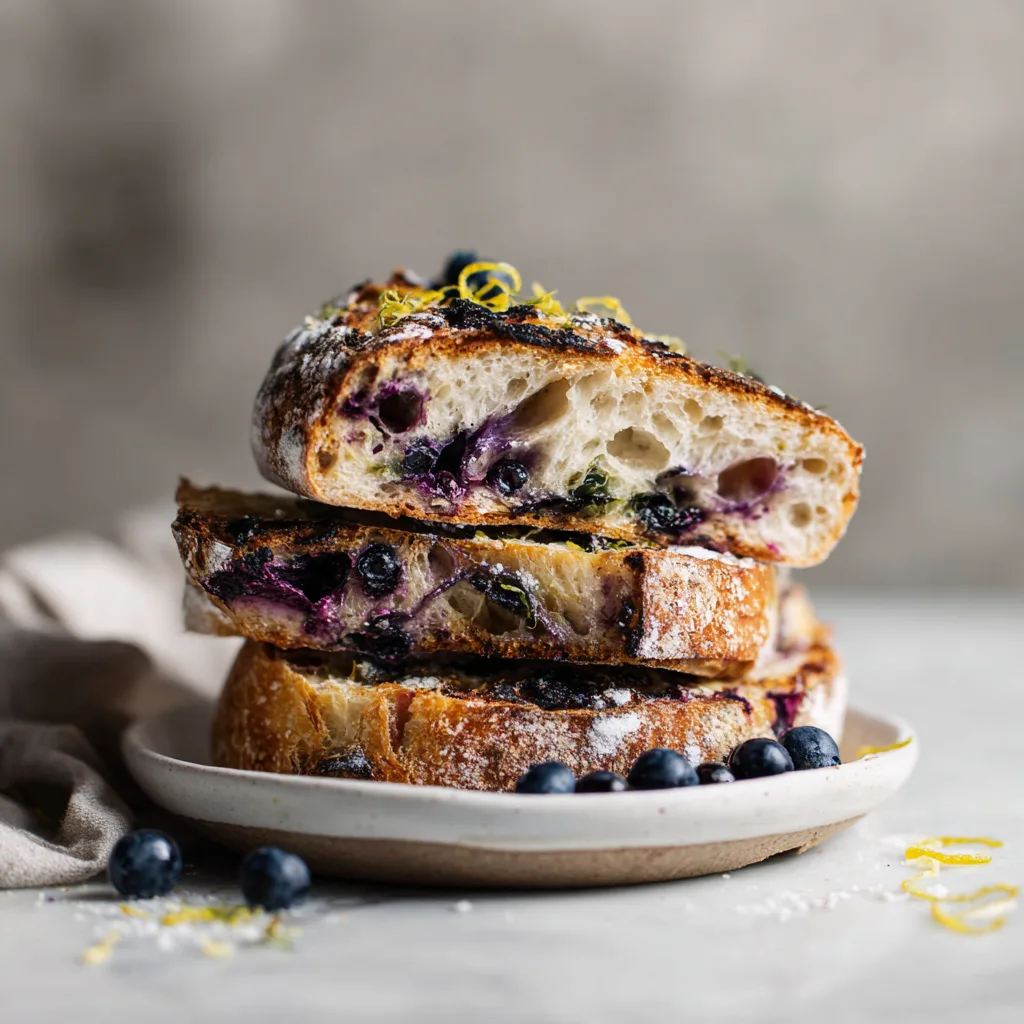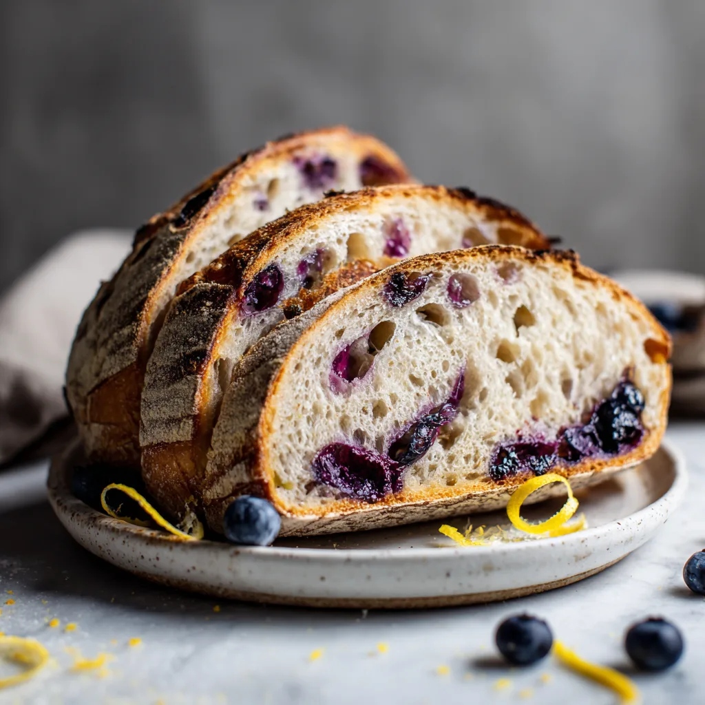 Sourdough’s mild acidity is a natural partner for fruit. Blueberries bring sweetness and moisture, while lemon zest intensifies aroma without adding excess liquid. Together, they create contrast: tangy crumb, sweet fruit, and citrusy top notes.