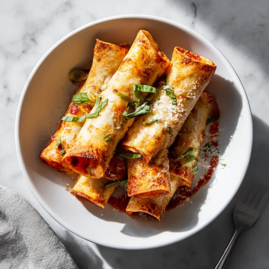 Pizza tortilla rolls are soft flour tortillas filled with pizza sauce, cheese, and toppings, then tightly rolled and baked, pan-fried, or air-fried until crispy outside and melty inside. Think of them as a cross between a quesadilla and a pizza roll — easy to eat, dunk, and share.