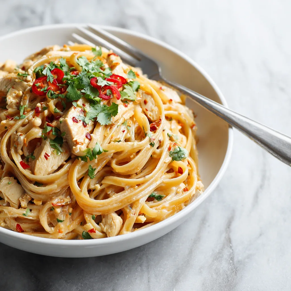 A rich and flavorful fusion pasta made with tender chicken, coconut milk, peanut butter, and Thai-inspired spices.