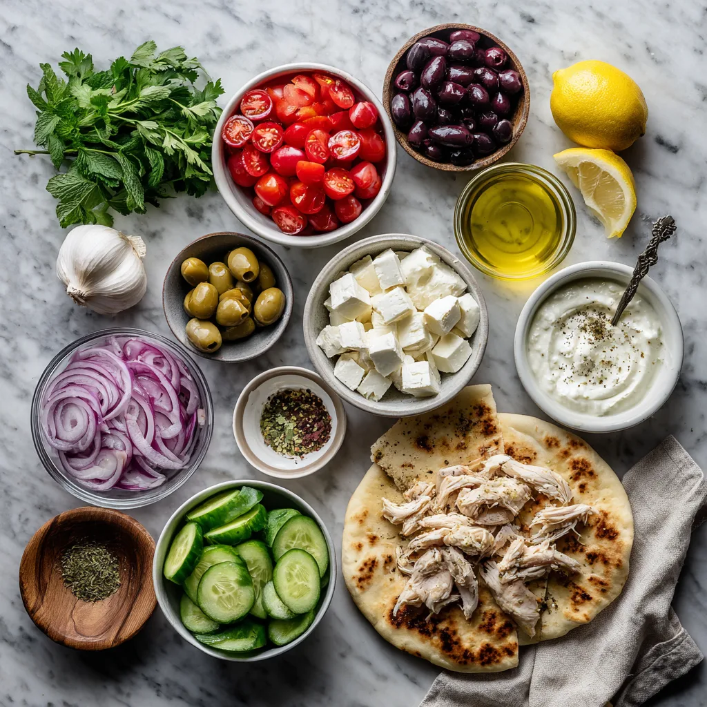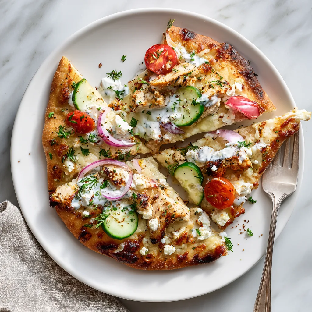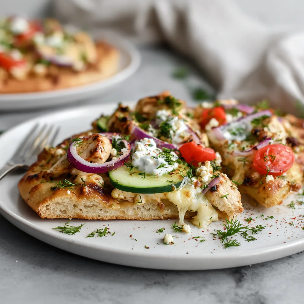 A Mediterranean-inspired skillet flatbread topped with juicy Greek-marinated chicken, melty cheese, fresh vegetables, and creamy tzatziki.
