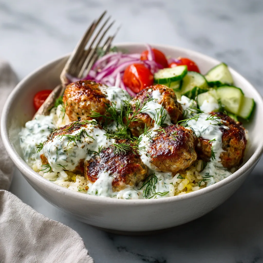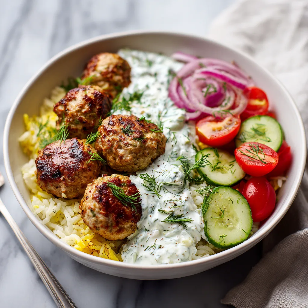 - Assemble bowls with grains, meatballs, vegetables, and tzatziki.