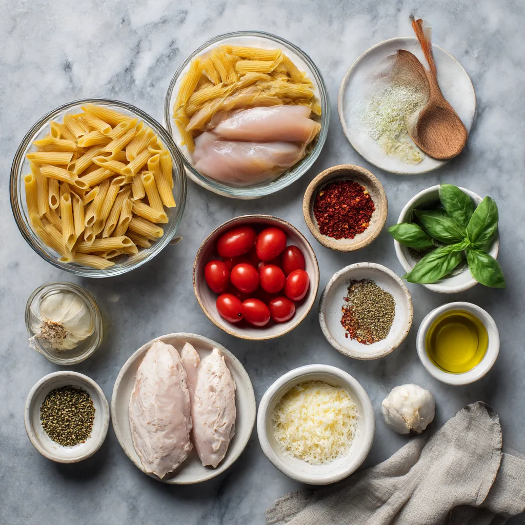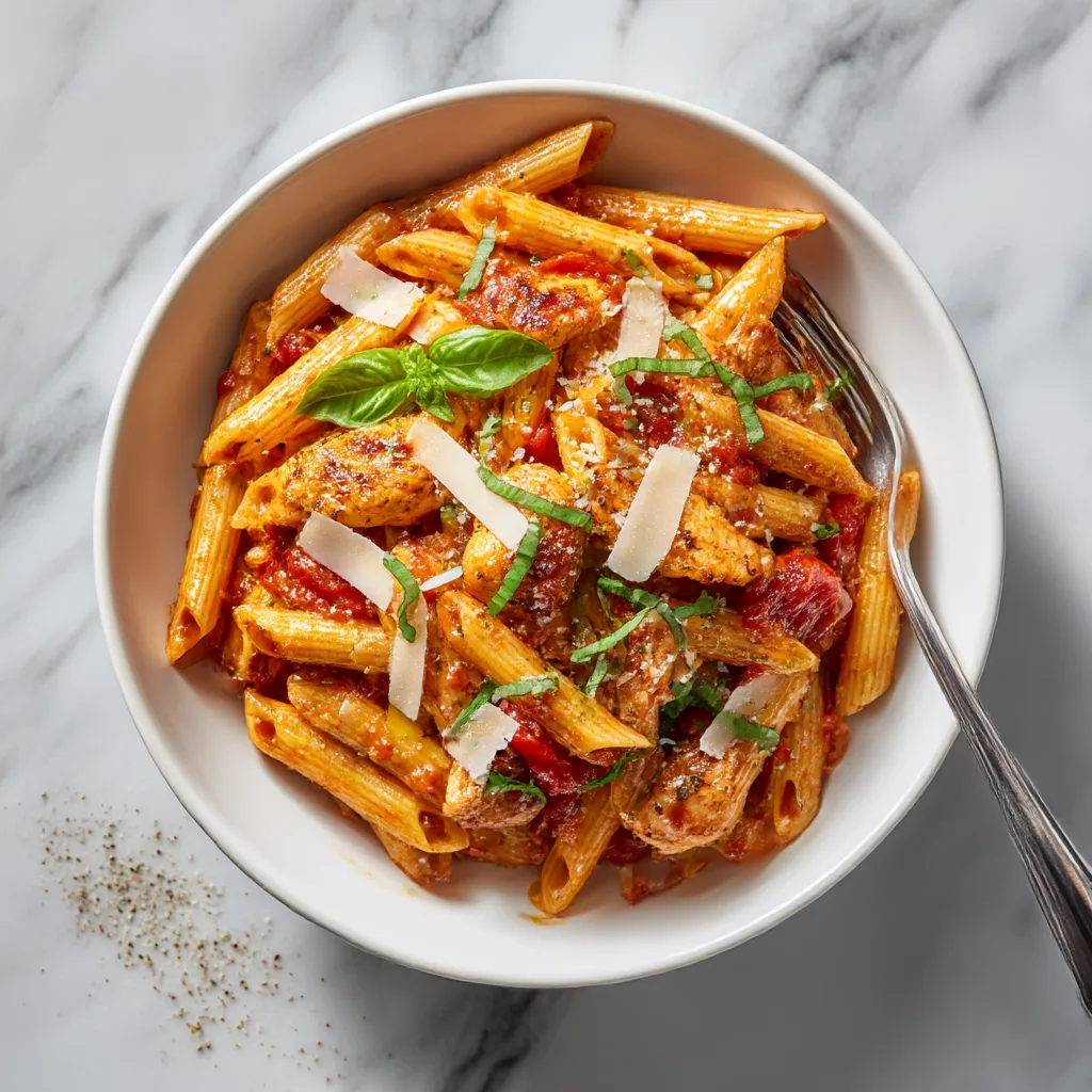 A vibrant Mediterranean pasta featuring juicy chicken, sweet tomatoes, garlic, basil, and Parmesan tossed with tender penne.