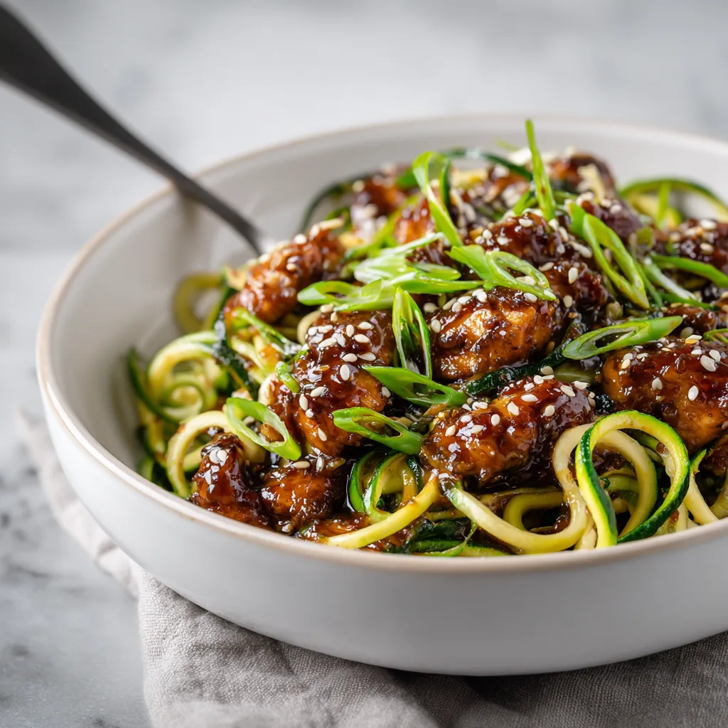 Sesame chicken is inspired by Chinese-American takeout classics, known for sweet, savory sauces and crispy protein. This version keeps the flavor spirit but gives it a modern, healthy upgrade using zucchini noodles and lighter cooking techniques.