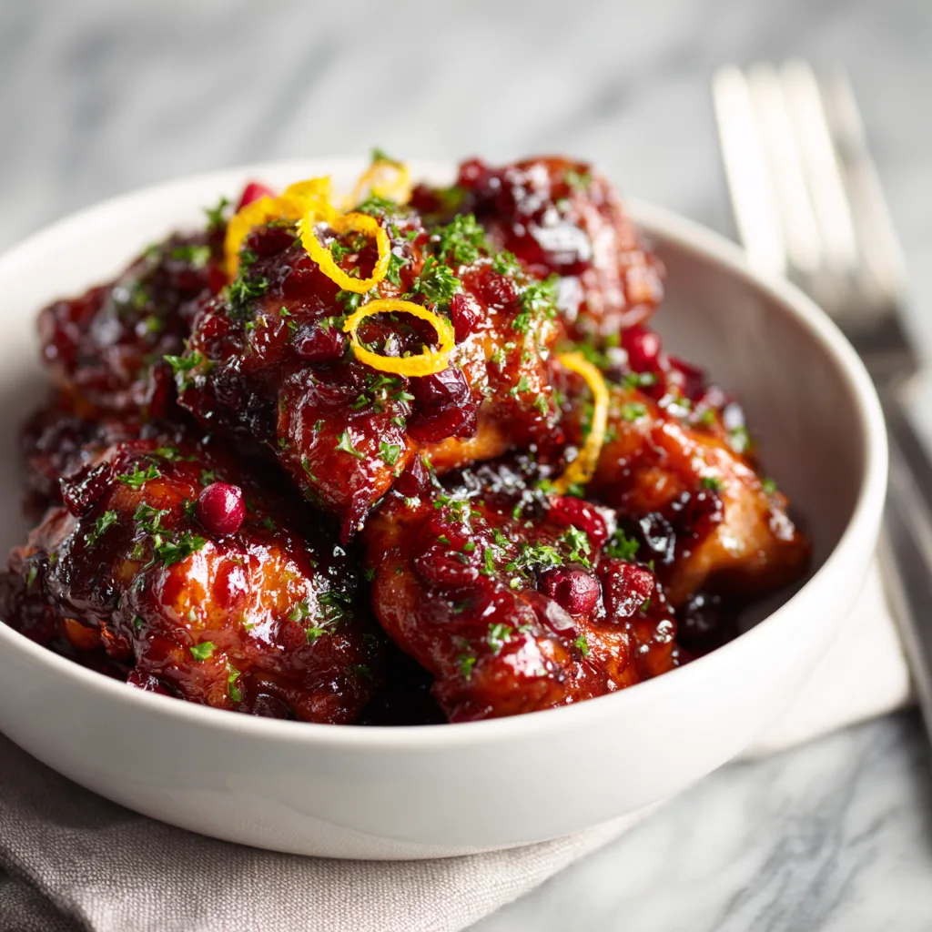 A sweet and savory chicken dish coated in a glossy cranberry-orange glaze.