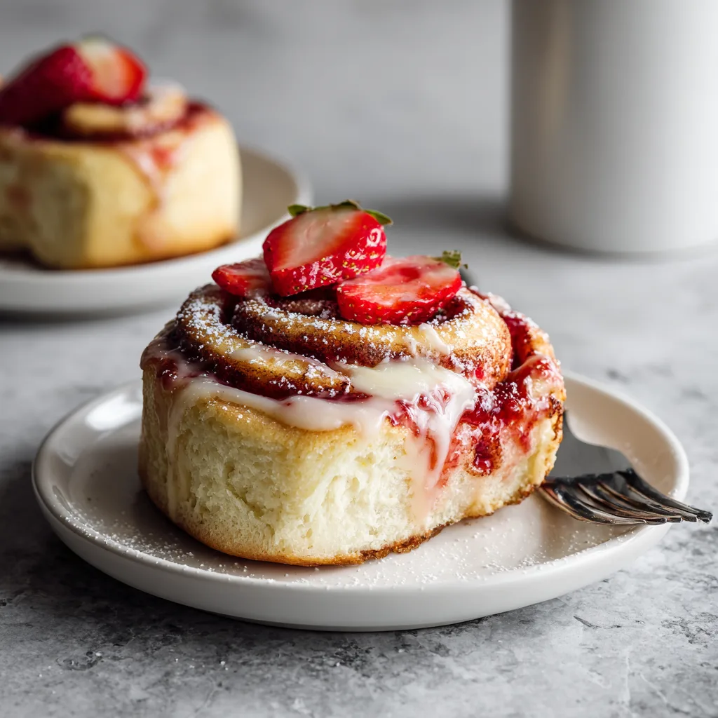 Soft yeast rolls filled with creamy cheesecake and sweet strawberry swirls, topped with a vanilla glaze.