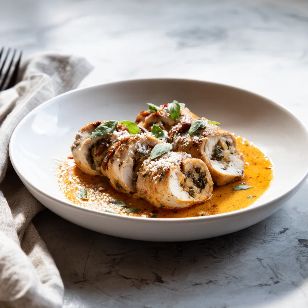Tender chicken breasts rolled with a creamy spinach and sun-dried tomato filling, simmered in a rich Tuscan-style garlic cream sauce.