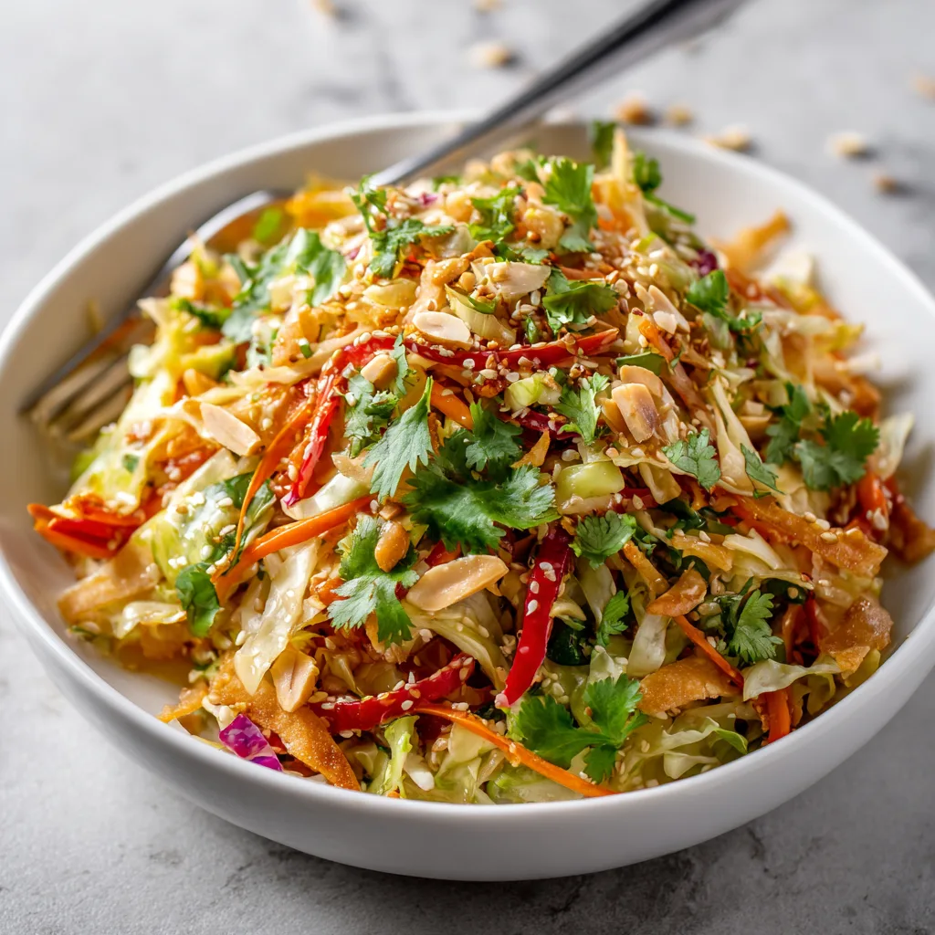 Cabbage-based salads are common in many cultures because they are affordable, durable, and versatile. This modern version brings together classic pantry ingredients with bold flavors for a globally inspired dish.